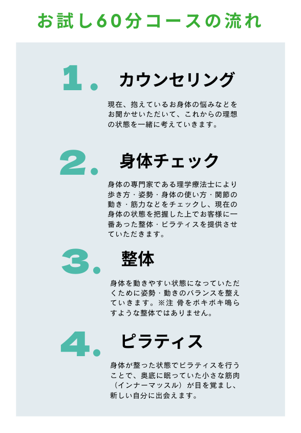 からだ工房 hananono.では安心・安全に整体・ピラティスを行うために姿勢・動きの専門家「理学療法士」による身体チェックを行います。